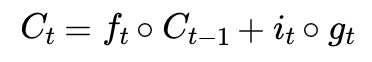 삭제게이트와 입력게이트에서 만들어진 ft(중요도),Ct-1(과거의 정보)와 it(중요도),gt(현재의 정보)는 각각 원소별 곱을 통해 Ct(현재 셀 상태 정보)를 구하는데 사용된다.