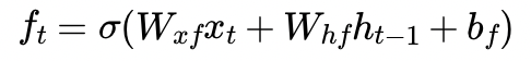 셀 상태의 수식은 다음과 같은데, 시그모이드 함수를 통과해 0과 1사이의 값을 리턴하고, 그 값이 0에 가까울수록 정보를 많이 삭제하고, 1에 가까울수록 정보를 온전히 기억한다.