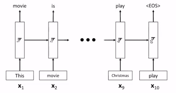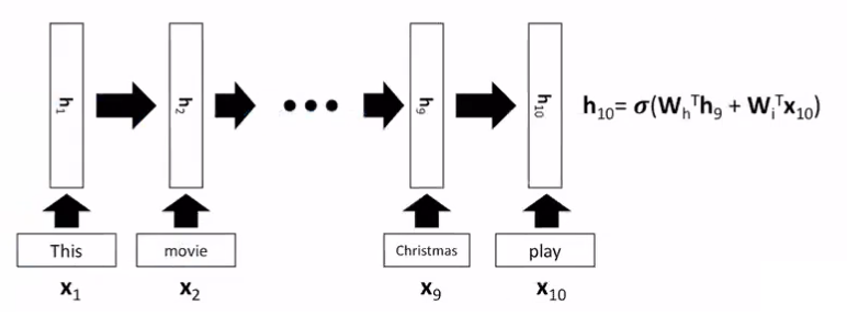 RNN을 사용하면 [0, 0, 0, 0, 0, 1, 0, 0, 0, 0, 0, .... , 0] ( = This) 이런 This에 해당하는 원 핫 벡터를 첫 input(x1)으로 받고 h1을 만들고 이후 x2, x3 등의 값을 순차적으로 받아 최종적인 h10을 생성한다.