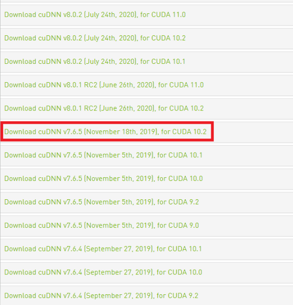 cuDNN v7.6.5 for CUDA 10.2를 설치해주면 된다!